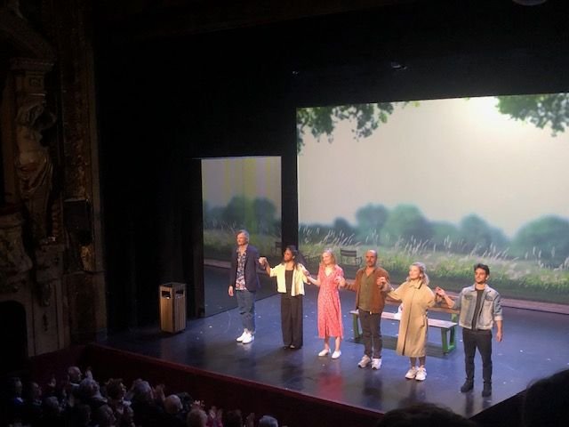 L’auteure nous offre un joli moment tendre et poétique, avec cette histoire simple de tous les jours, bien écrite, aux dialogues justes et ciselés. Une pièce sur la complexité du désir et la beauté des rencontres éphémères. Ce banc sert un peu de refuge pour ces deux êtres aux vies respectives compliquées. Une parenthèse de bonheur, une vraie bouffée d’air pur! Quand l’amitié flirte avec l’amour… Franchiront ils le pas? La mise en scène est sobre et rythmée avec des plans courts. La toile de fond de scène lumineuse change au gré des saisons. Tous les comédiens sont bien dans le ton mais avec une mention spéciale pour le duo Carré:Campan. Il y a une alchimie entre les deux complices qui s’entendent à merveille pour nous faire rire ou nous émouvoir, Isabelle nous dévoilant toute sa palette de jeu face à un Campan bourru et attachant. Paul Eluard a dit: “Il n’y a pas de hasard, il n’y a que des rendez-vous !”.